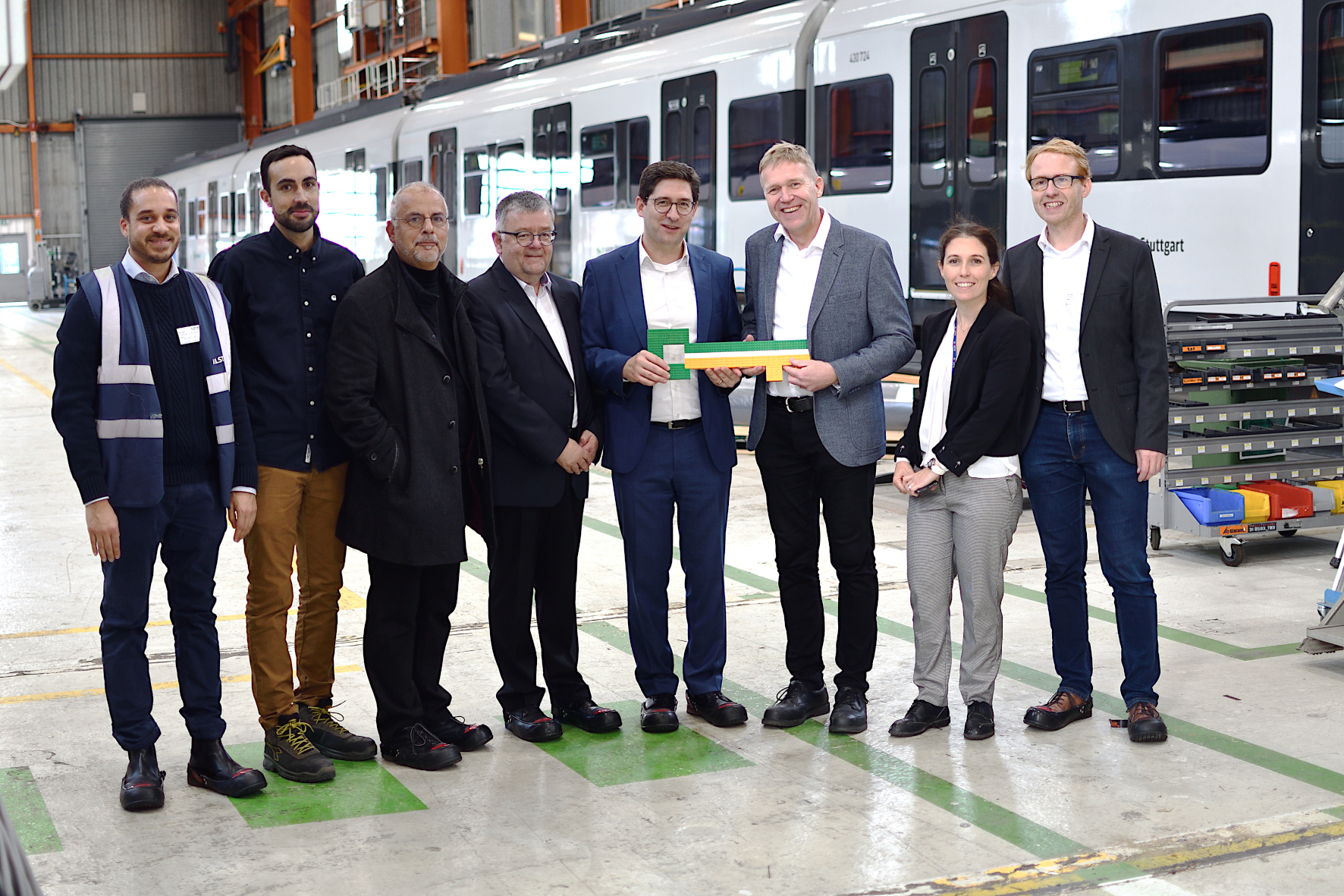 Dr. Dirk Rothenstein (4. von rechts), Vorsitzender der Geschäftsleitung der S-Bahn Stuttgart, bei der symbolischen Schlüsselübergabe an Alstom. / Bild: Alstom