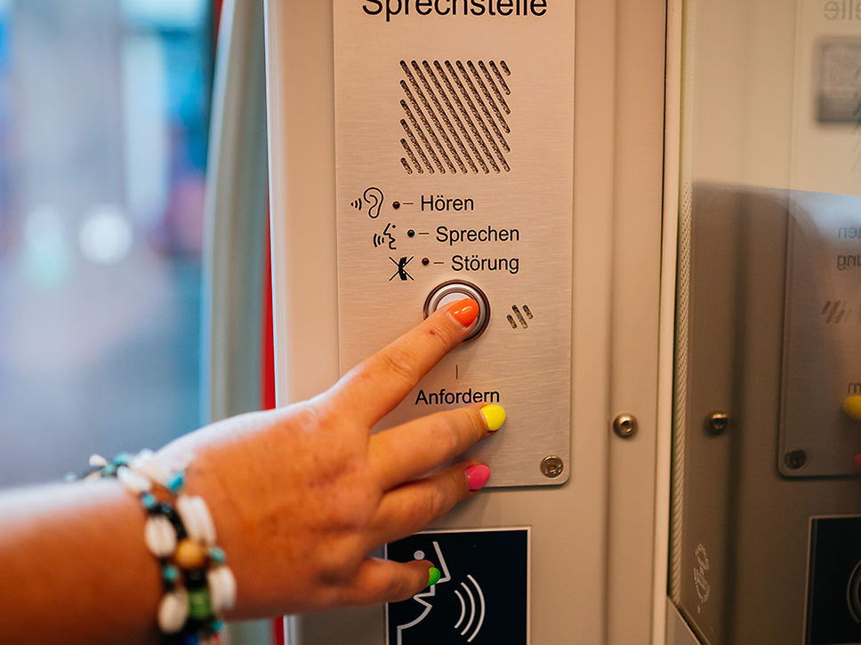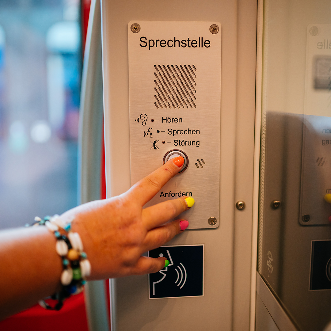 Falls erforderlich, können Sie Kontakt mit dem Triebwagenführer aufnehmen. Bei Fragen an den Triebwagenführer können Sie die Sprechstelle in der S-Bahn nutzen. Bitte beachten Sie die Lampenanzeige: Der Triebwagenführer kann Sie erst hören, wenn das „Sprechen“-Lämpchen grün leuchtet.