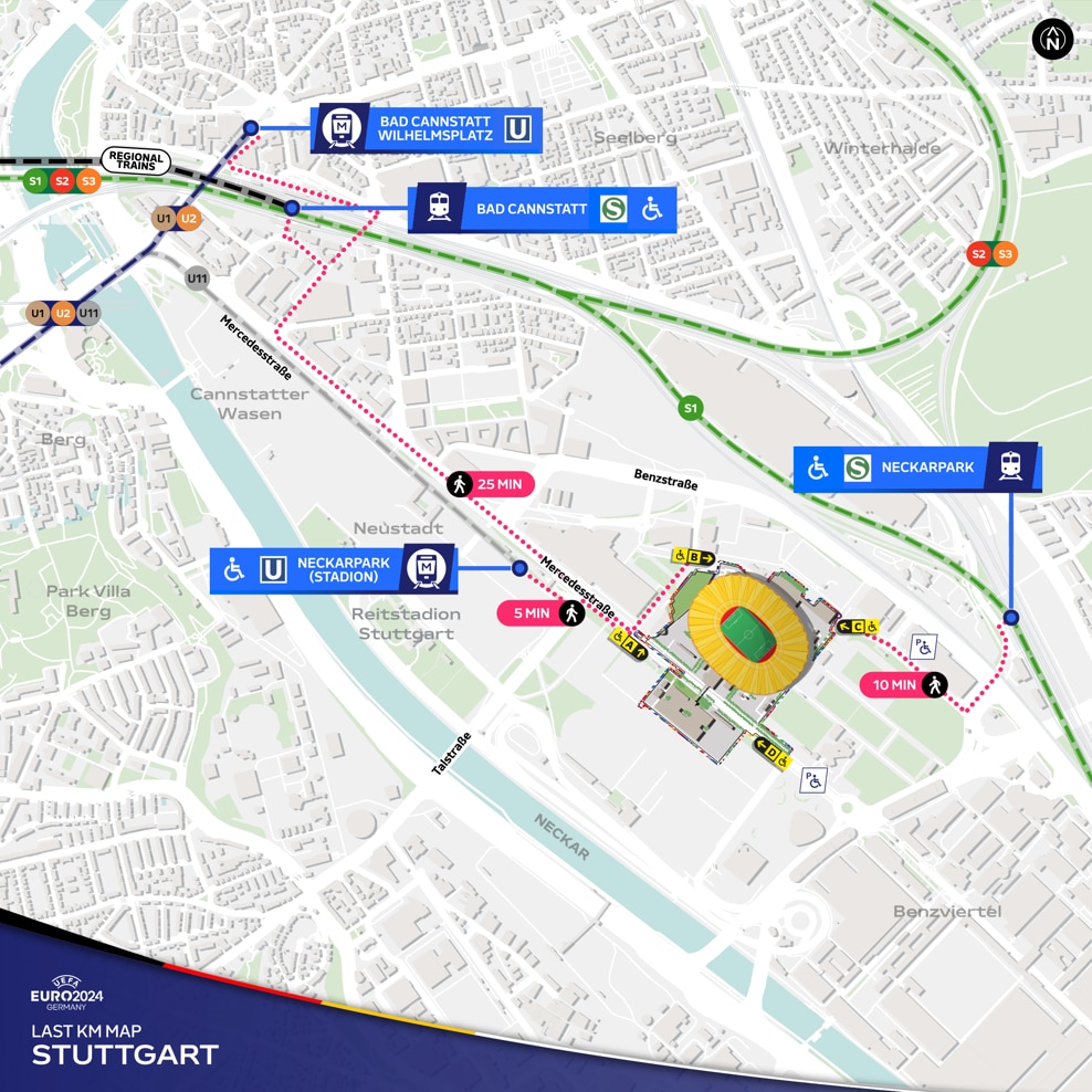 From the Fan Zones to the Arena Stuttgart entrances A and B (approx. 32 minutes)