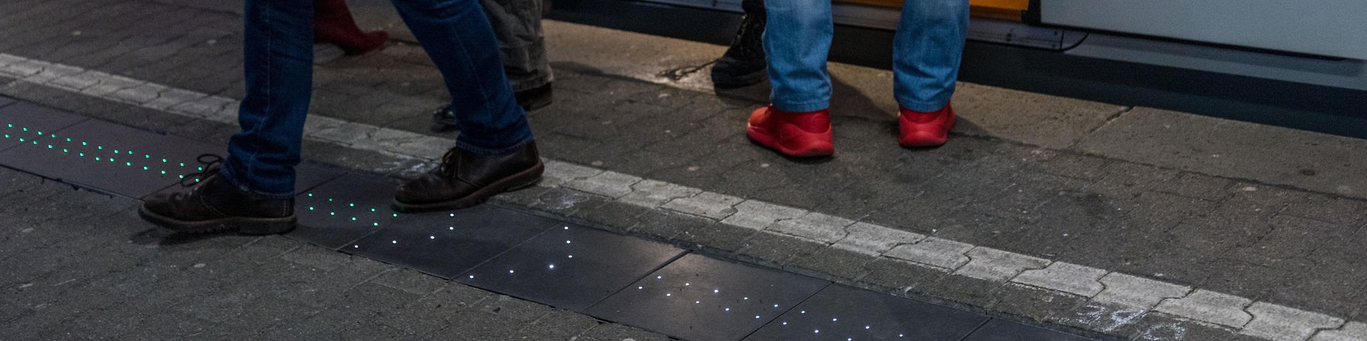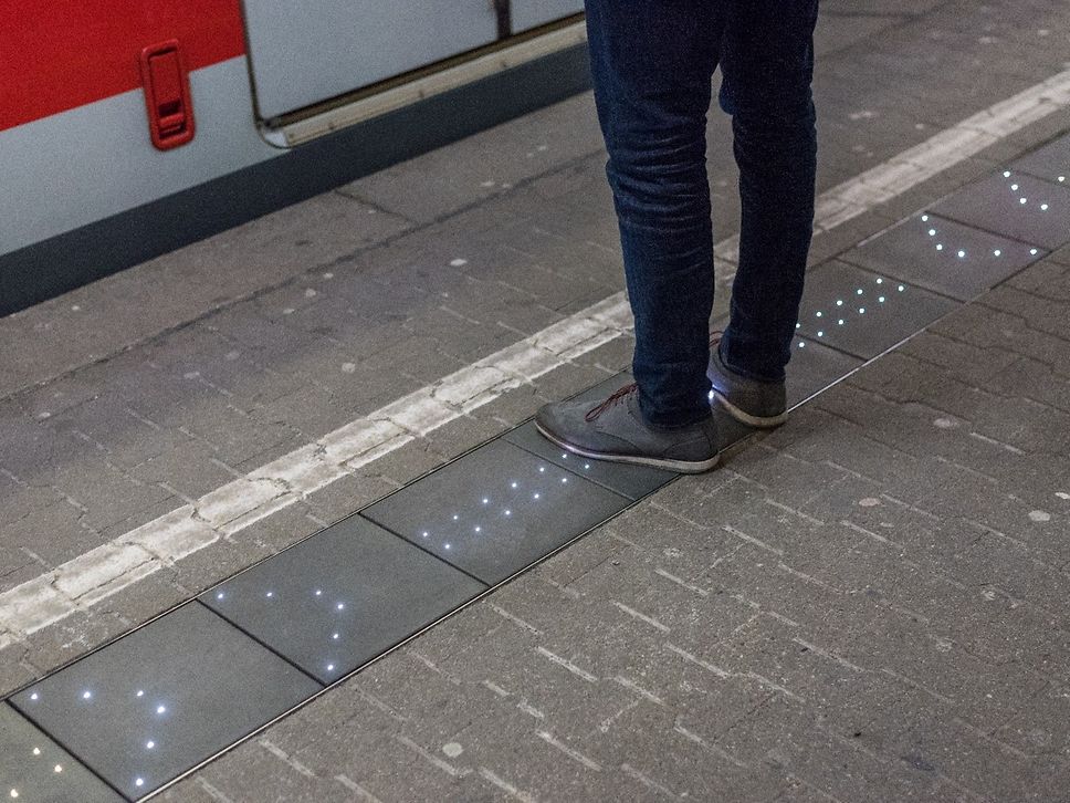Seit März 2018 testet die S-Bahn Stuttgart die leuchtende Bahnsteigkante im Bahnhof Bad Cannstatt. Lichtfaserbeton-Platten bringen Symbole im Bodenbelag zum Leuchten, die den Fahrgästen am Gleis 2 die für sie günstigen Wartepositionen bereits vor Einfahrt des Zuges anzeigen und ihnen so die Orientierung auf dem Bahnsteig erleichtern sollen. „Damit wollen wir zu lange Haltezeiten vermeiden“, sagt Rothenstein. Im Testbetrieb soll sich zeigen, in wie weit sich damit die Pünktlichkeit stabilisieren lässt.