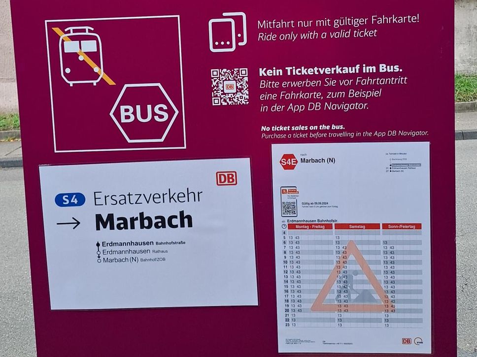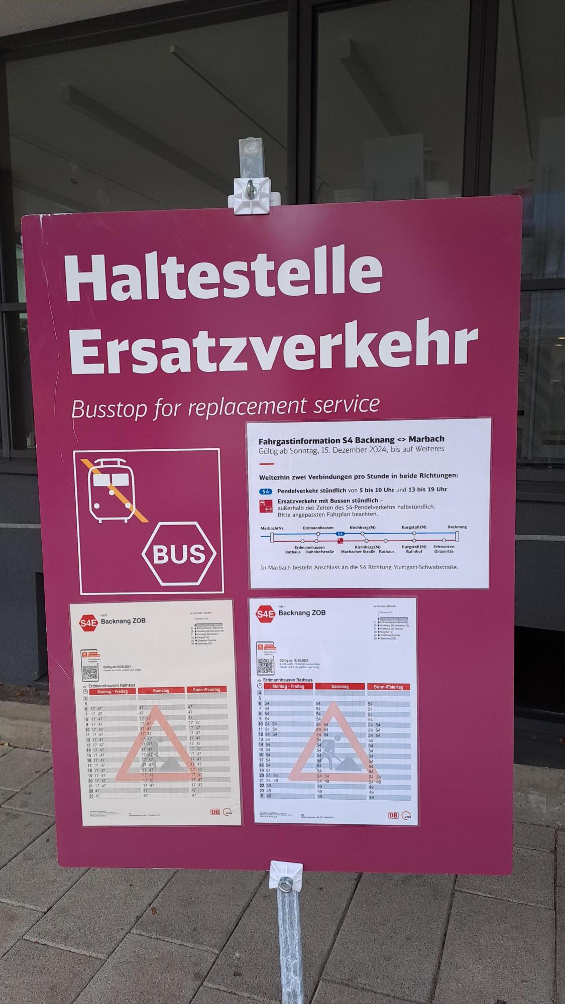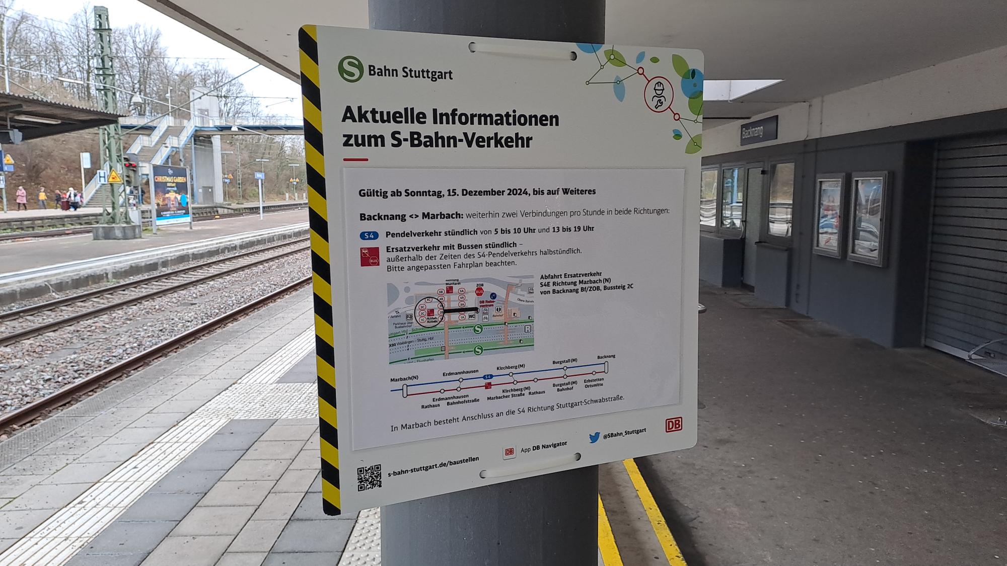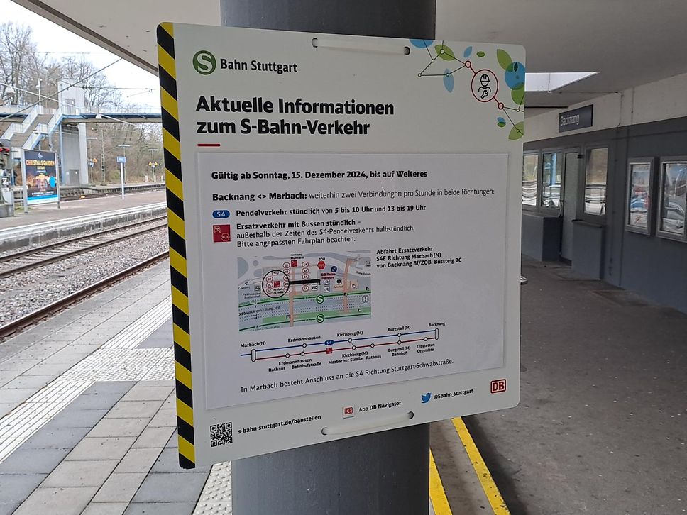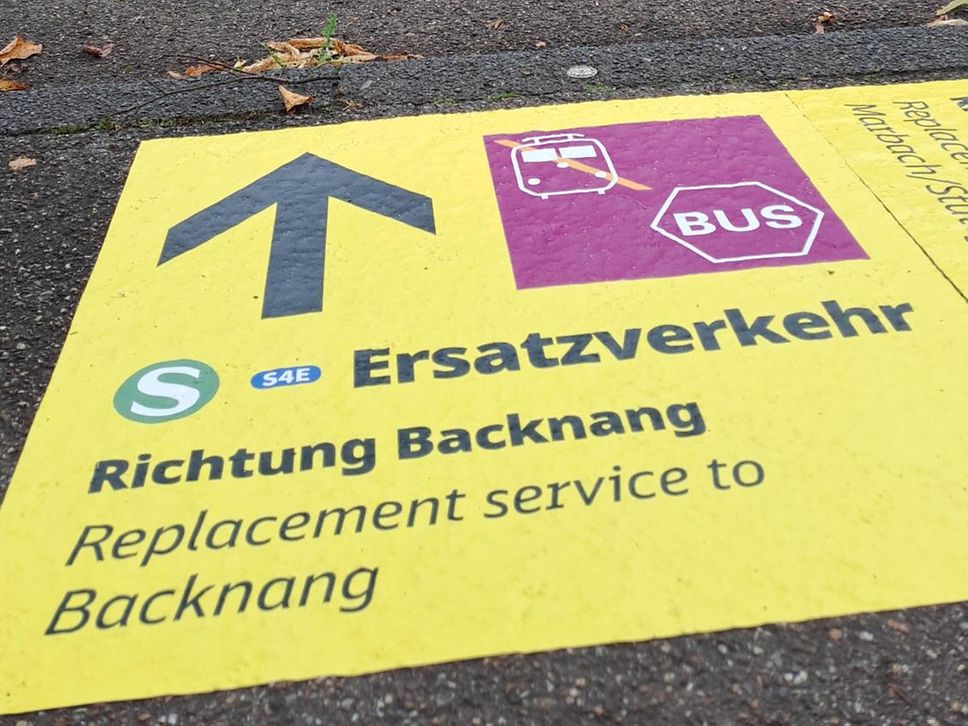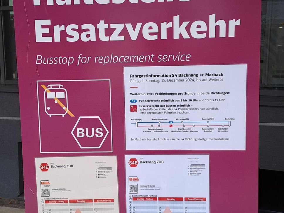 Zwischen den Bahnhöfen Marbach und Backnang hat die DB einen Ersatzverkehr mit Bussen (S4E) im 30-Minuten-Takt eingerichtet. Die Busse des Ersatzverkehrs sind besonders gekennzeichnet.