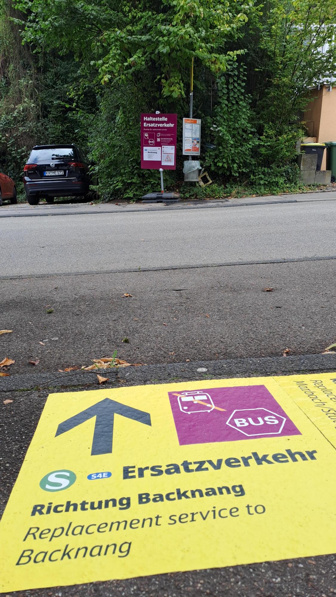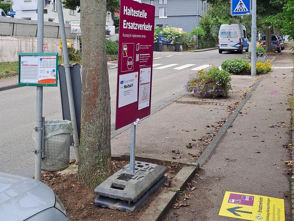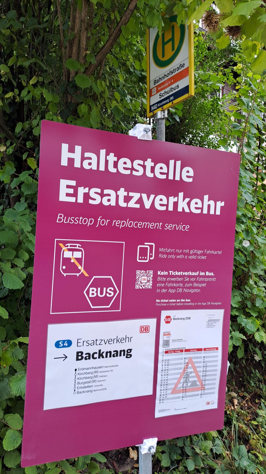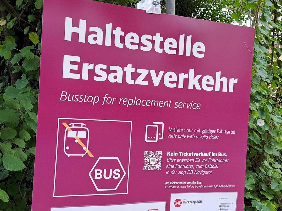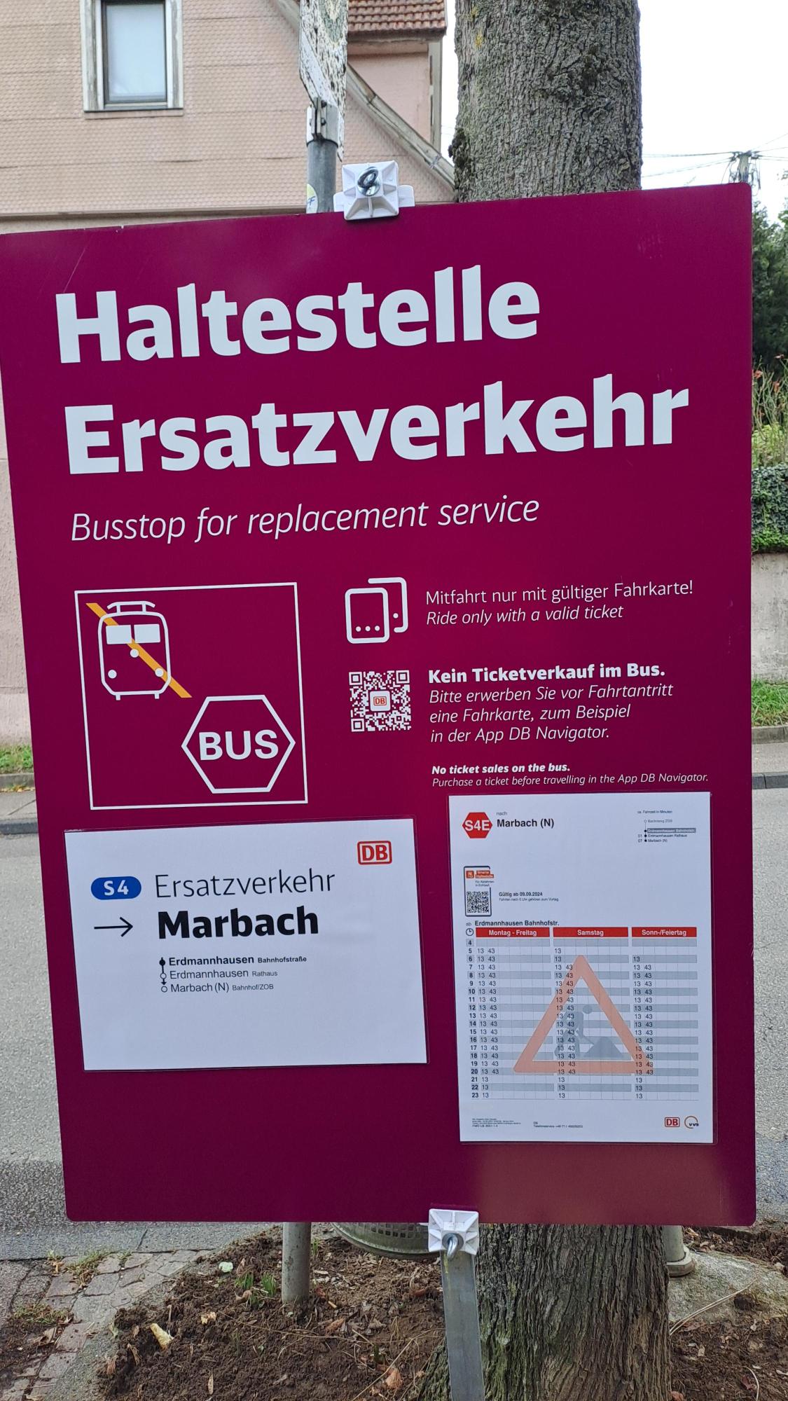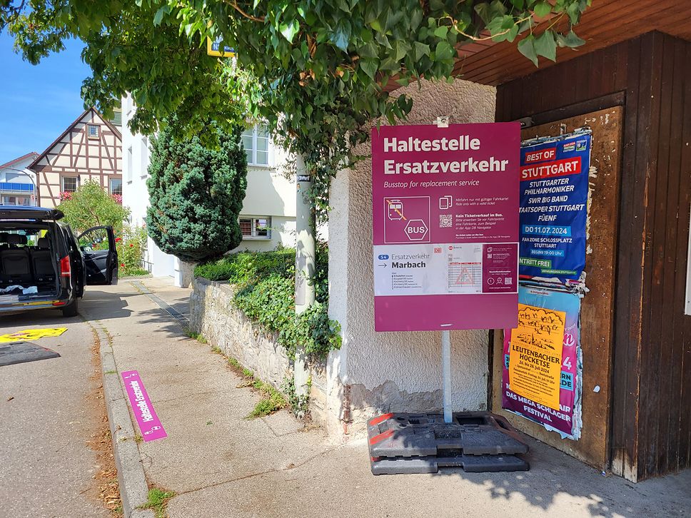 Zwischen den Bahnhöfen Marbach und Backnang hat die DB einen Ersatzverkehr mit Bussen (S4E) im 30-Minuten-Takt eingerichtet. Die Busse des Ersatzverkehrs sind besonders gekennzeichnet.
