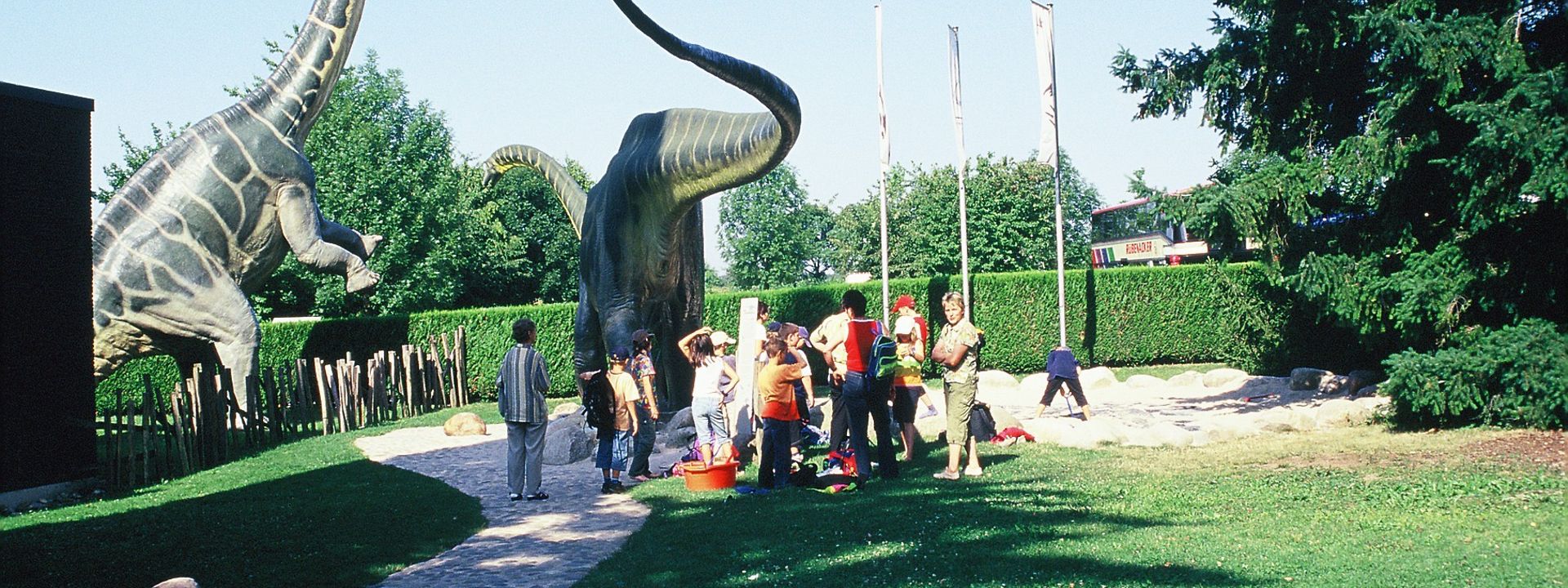 Im Garten rund um das Museum trifft man an einem See zwischen urweltlichen Schachtelhalmen, Ginkgo- und Mammutbäumen auf acht lebensgroße Dinosaurier. Diplodocus, Stegosaurier, Iguanodon, Deinonychus, Plateosaurus und Allosaurus. Ein Saurier ist in einem Grabungsfeld verborgen.