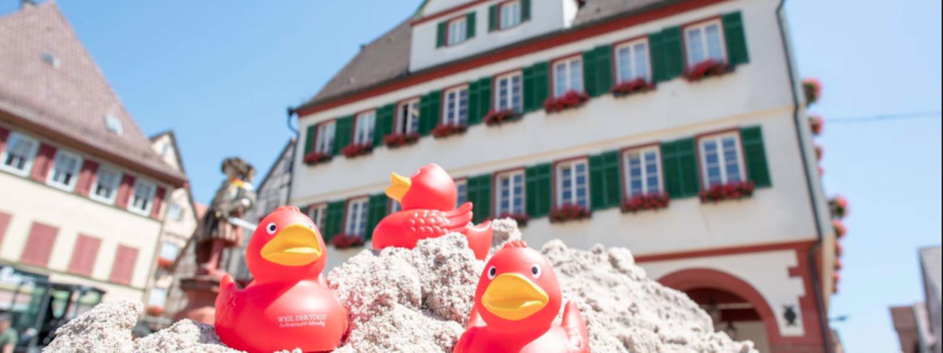 Der rote Turm, auch "Diebsturm" genannt, hat ein Verlies im Erdgeschoss. Er diente als Gefängnis für Schwerverbrecher. Und Schwerverbrecher war man schnell, wie der Hechtwirt Debler, er saß hier 1754 ein wegen Falschmünzerei. Das Renaissance Rathaus von 1582 wurde nach dem Stadtbrand im Jahr 1669 wieder aufgebaut. Die Rundbogenlaube war früher Markthalle.