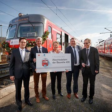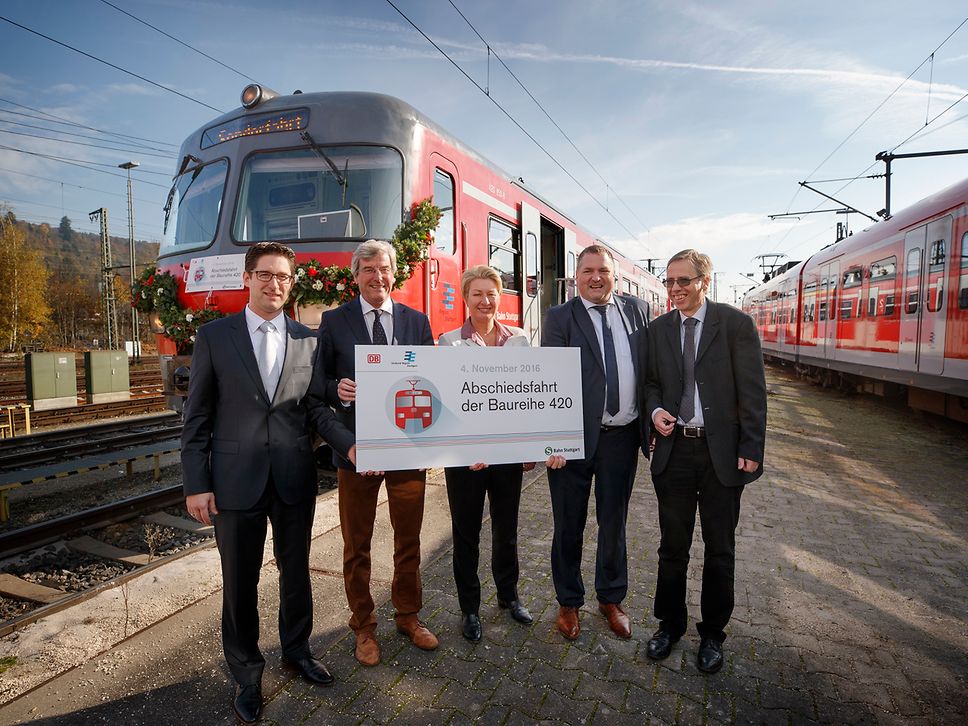 November 2016: Die zwei letzten S-Bahn-Fahrzeuge der Baureihe 420 haben nach 38 Jahren die S-Bahn Stuttgart verlassen. Am 4. November verabschiedeten Dr. Dirk Rothenstein, Sprecher der Geschäftsleitung der S-Bahn Stuttgart, Thomas S. Bopp, Vorsitzender des Verbands Region Stuttgart, und Nicola Schelling, Regionaldirektorin des Verbands Region Stuttgart, gemeinsam die beiden Fahrzeuge offiziell in den Ruhestand.